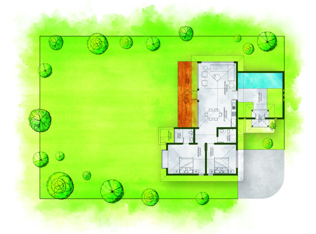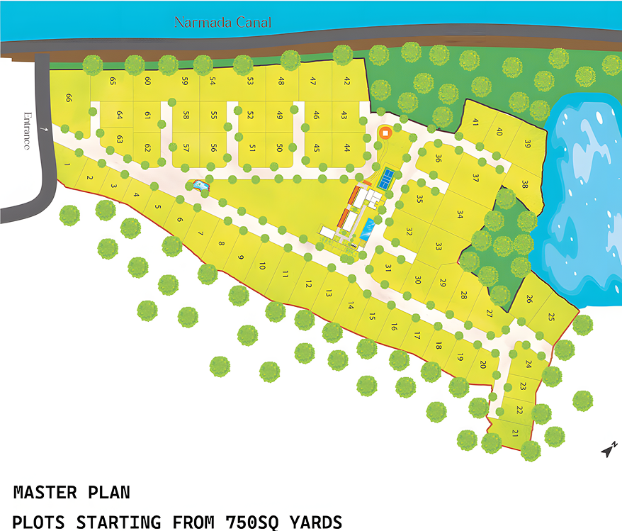 Located in close proximity of Narmada Canal, Misty Meadows is surrounded by dense flora, a lily pond and an existing outhouse having a distinctively vernacular typology. Choose your kind of plot/ weekend villa from a total of 66 plots. A delicately balanced weekend home in the outskirts of Ahmedabad provides respite from the limitations in the city.Located at the cusp of urbanization, its neighborhood of residential plots weaves between agricultural tracts, and birds from a nearby Thol Bird Sanctuary to drop in.